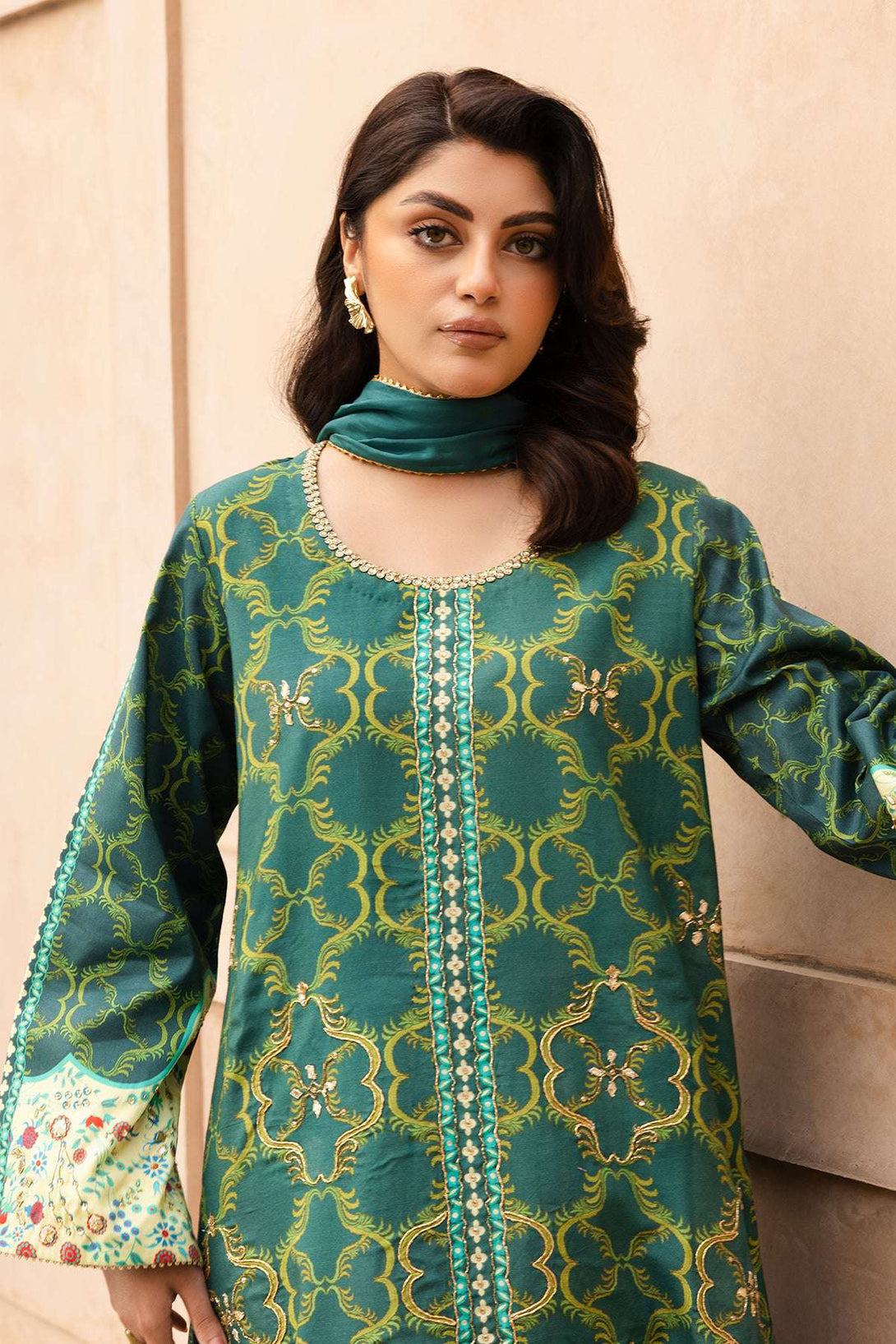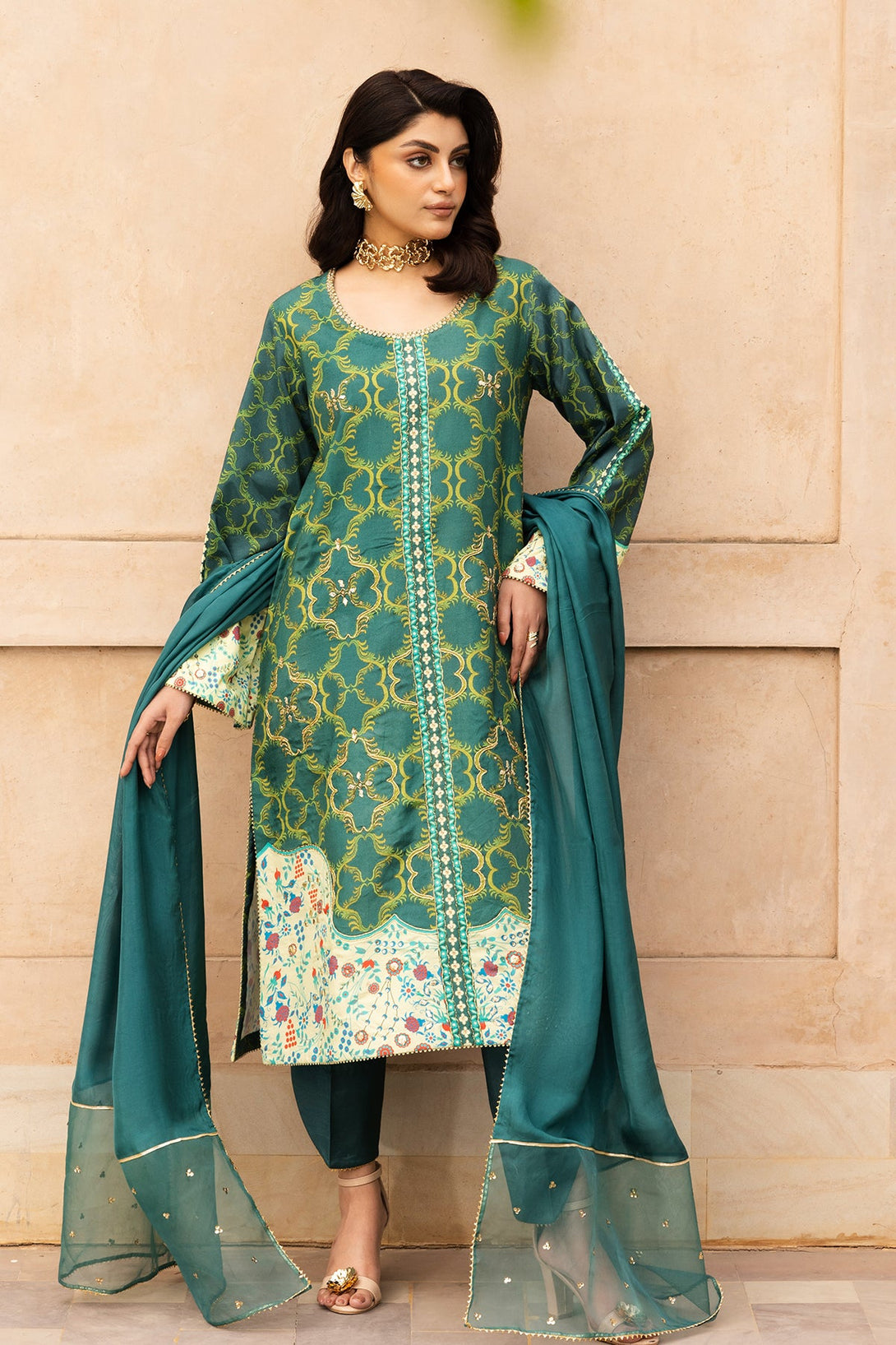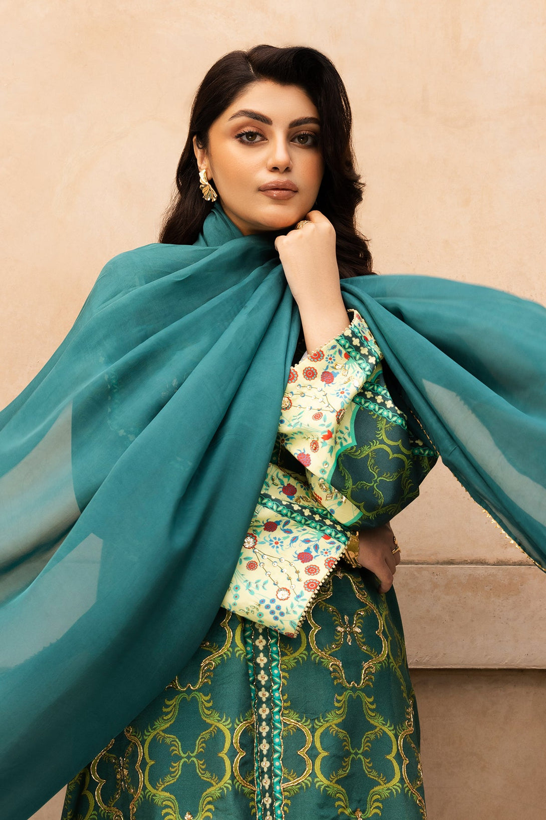 Step into elegance with Arwa, a teal green raw silk outfit designed for those who appreciate fine craftsmanship. The straight-cut silhouette showcases intricate adda work, including gota, dori, cut dana, sequins, and crystals, adding texture and depth to the design. The gold geometric patterns and floral borders in vibrant hues at the hem enhance the luxurious appeal. Complementing the shirt is a matching raw silk trouser with gota detailing, while the medium silk dupatta with organza pallus and hand-placed sequins provides a graceful, delicate shimmer.
