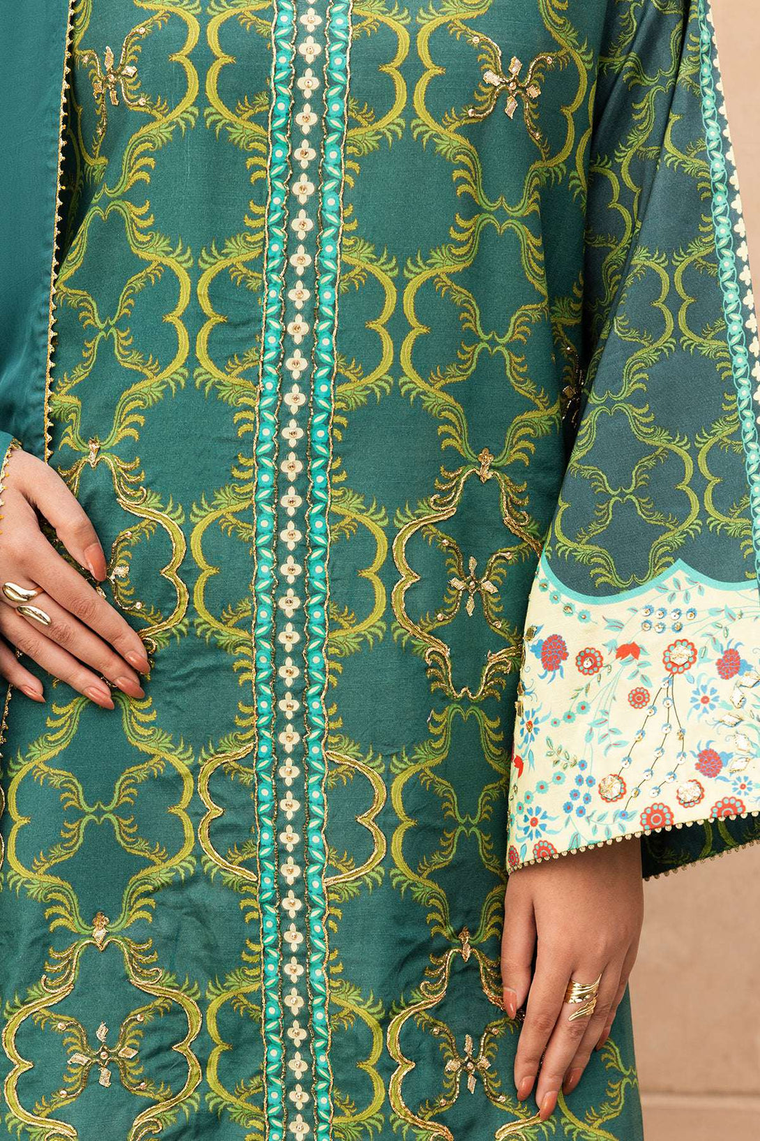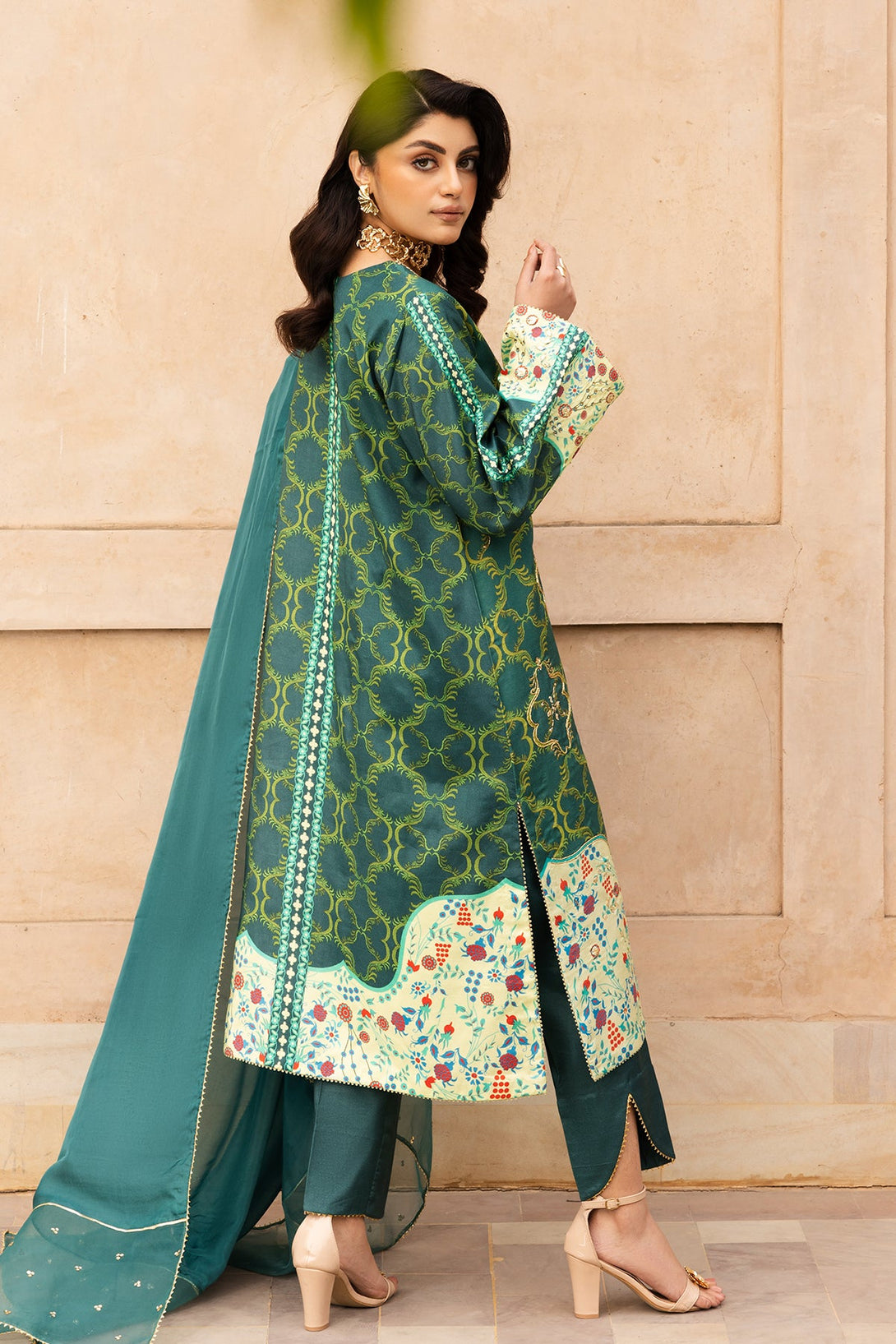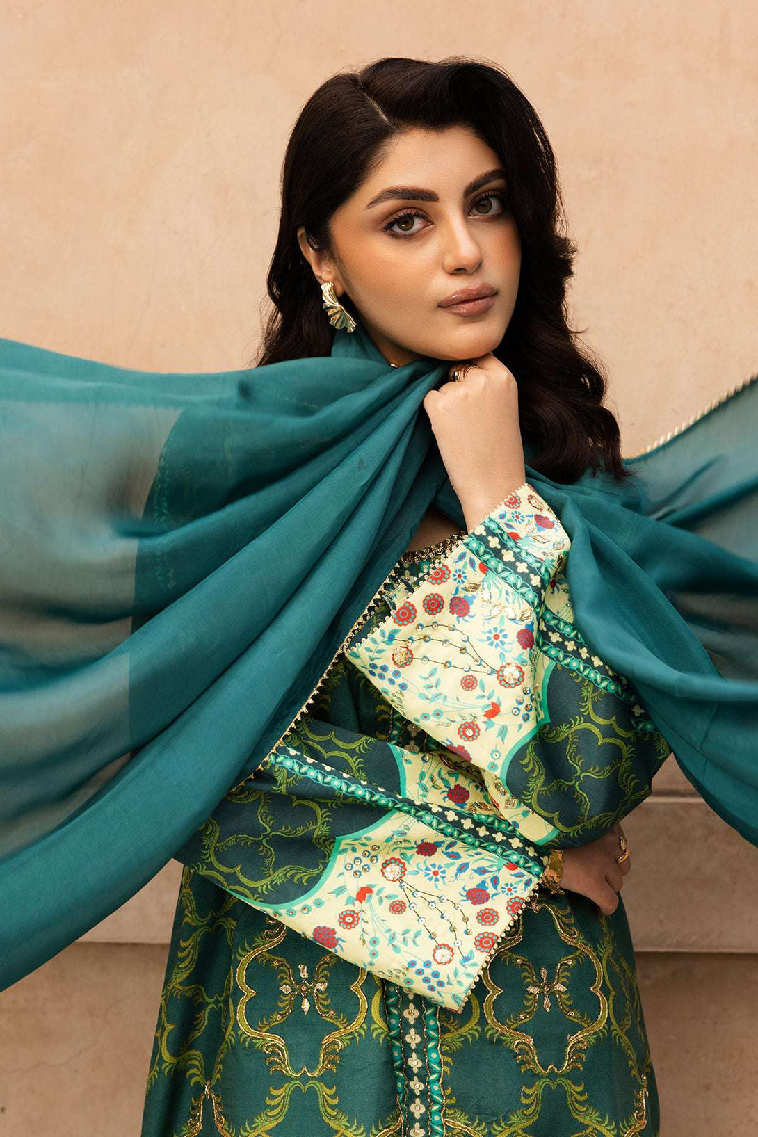 Step into elegance with Arwa, a teal green raw silk outfit designed for those who appreciate fine craftsmanship. The straight-cut silhouette showcases intricate adda work, including gota, dori, cut dana, sequins, and crystals, adding texture and depth to the design. The gold geometric patterns and floral borders in vibrant hues at the hem enhance the luxurious appeal. Complementing the shirt is a matching raw silk trouser with gota detailing, while the medium silk dupatta with organza pallus and hand-placed sequins provides a graceful, delicate shimmer.